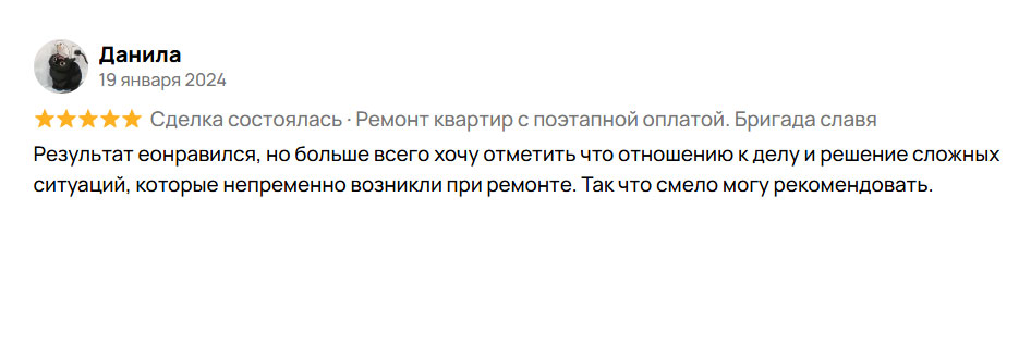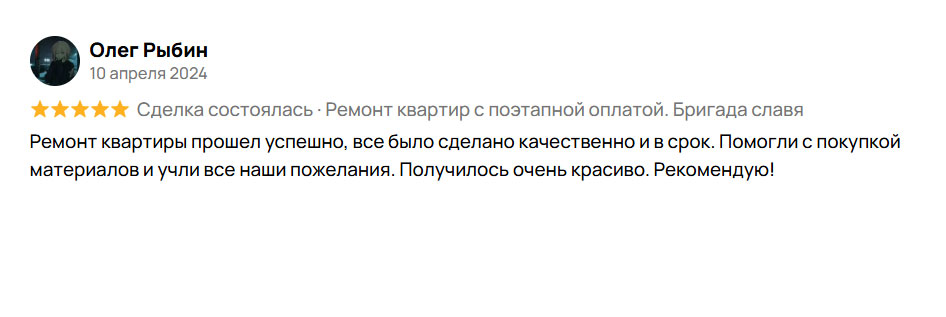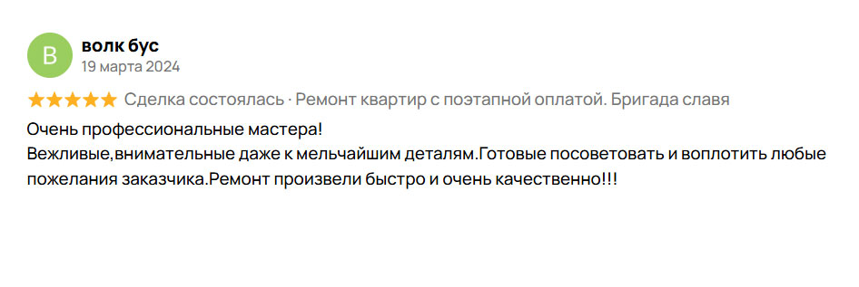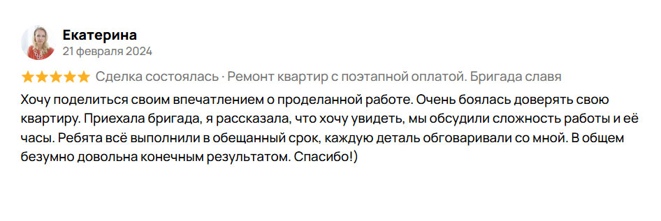 Весь процесс ремонта осуществляется в несколько этапов, каждый из них принимается вами отдельно, если вас все устраивает, производите оплату за выполненные работы.